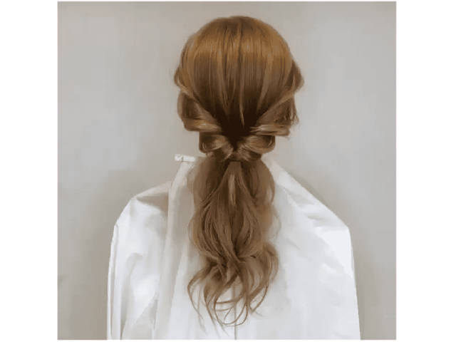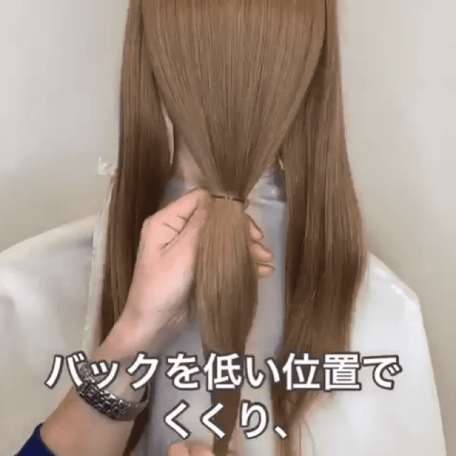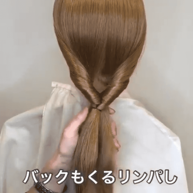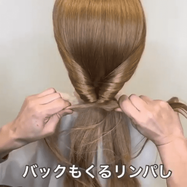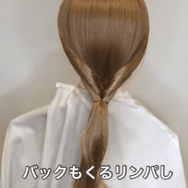 続いて、中央(バック)でくくった毛束のみをくるりんぱしましょう!