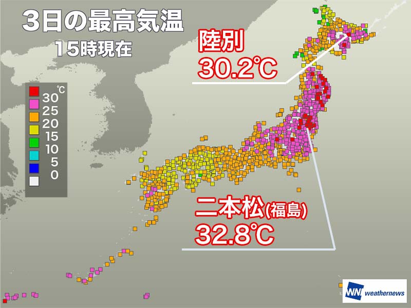 15時までに全国で最も気温が上がったのは福島県二本松で32.8℃、福島も31.1℃を観測し、2日連続の真夏日です。また、北海道でも中徹別や陸別など4地点で30℃を超えています。