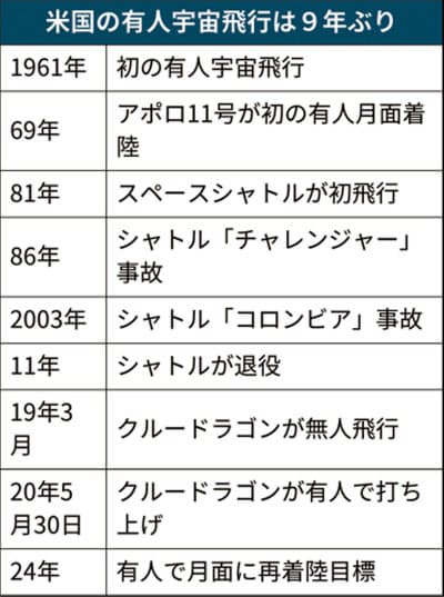巨額の費用とリスクが伴う有人宇宙開発は、旧ソ連と競った1960年代から「アポロ」など政府が一貫して担ってきた。2度の事故で安全対策のコストが膨らんだシャトルの反省から、NASAは民間に開発を移管した。スペースXとボーイングに競わせ、資金と技術を提供する側面支援に回った。NASAは政府主導で開発するより「200億~300億ドルを節約できた」と主張する。