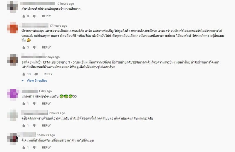 ขณะที่แฟนๆ ต่างคอมเมนต์ต่างๆนานา ว่าหากเป็นแบบนั้นจริง หากไม่ใช่ทั้งคู่จัดคงเลิกติดตามรายการแล้ว “ไม่ใช่ว่าดีเจเซทใหม่ไม่ดีนะครับ แต่ถ้าไม่ใช่พี่โอ๊ตพี่อาร์ตมันก็ไม่ใช่จันทร์ช๊อคโลกแล้วครับ” , “คือจันทร์ช็อคโลกถ้าไม่มีโอ๊ต อาร์ท มันก็ไม่ใช่อ่ะนะ ไม่ใช่ว่าดีเจ 2 ท่านไม่ดี แค่มันไม่ใช่ ถ้างั้นก็แนะนำว่าให้เปลี่ยน ๆ ชื่อรายการไปซะ” , “สงสารดีเจที่มาแทนวันนี้จัง บางทีก็อยากให้คนดูให้เกียรติดีเจที่มาแทนบ้าง เชื่อว่าทุกคนทำเต็มที่ สู้ ๆ ฮะะ” คงต้องรอฟังคำชี้แจงความจริงว่าเกิดดอะไรขึ้นกันแน่