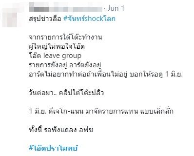 รวมทั้งยังมีคนทวีตปมดังกล่าวอีกด้วยว่า “สรุปข่าวลือ #จันทร์shockโลก จากรายการใต้โต๊ะทำงาน ผู้ใหญ่ไม่พอใจโอ๊ต โอ๊ต leave group รายการยังอยู่ อาร์ตยังอยู่ อาร์ตไม่อยากทำต่อถ้าเพื่อนไม่อยู่ บอกให้รอดู 1 มิ.ย. วันต่อมา.. คลิปใต้โต๊ะปลิว 1 มิ.ย. ดีเจโก-แนน มาจัดรายการแทน แบบเลิ่กลั่ก ทั้งนี้ รอฟังแถลง อฟช #โอ๊ตปราโมทย์”