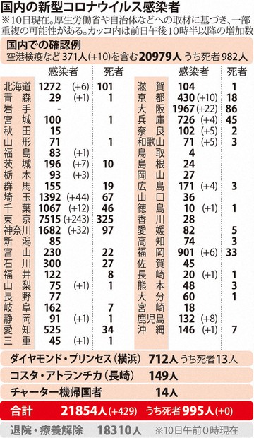 新型コロナウイルスの感染者は10日、新たに429人が確認された。うち10人は空港到着時の検疫で判明した。クルーズ船の乗客乗員らを合わせた国内の感染者数は2万1854人となった。1日当たりの感染者数が400人を超えたのは4月24日以来、約2カ月半ぶり。死者は確認されなかった。