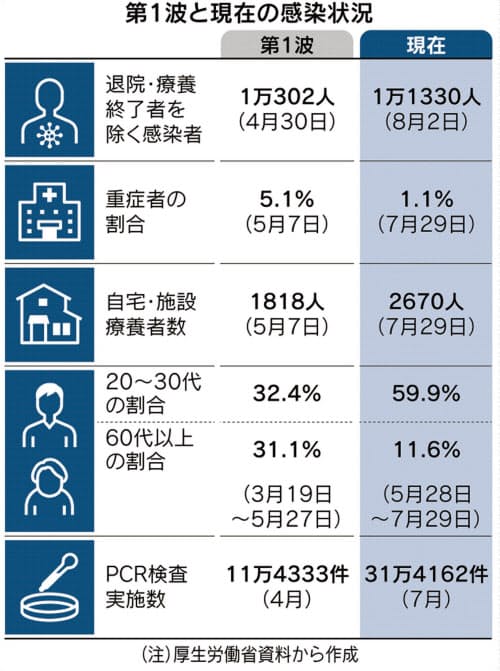 足元の感染者の約6割は20~30代の若年層だ。重症化リスクが高い60代以上の高齢者は第1波が31.1%いたのに対し、現在は11.6%だ。重症者の割合は5月7日の5.1%から7月29日には1.1%に下がった。