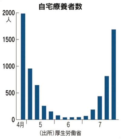 厚生労働省によると、7月29日時点で自宅で療養する感染者は全国で1686人。2週間前の436人から3.8倍となり、第1波のピークだった4月28日時点の1984人に近づいている。