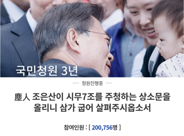 청와대 국민 청원 게시판에 옛 '상소문' 형식을 빌어 문재인 정부의 정책을 조목조목 비판한 이른바 '시무(時務) 상소문' 동의가 전날(27일) 공개 전환한 후 하루 만인 28일 청와대가 답변을 내놓아야 하는 기준인 20만 명을 돌파했다. 이날 오전 9시 30분 기준 지난 12일 올라온 ‘진인(塵人) 조은산이 시무 7조를 주청하는 상소문을 올리니 삼가 굽어살펴주시옵소서’라는 제목의 청원은 20만 756명의 동의를 얻었다.