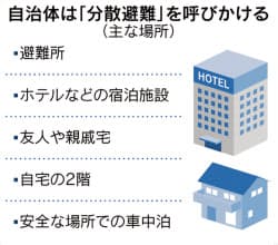 各自治体も避難所だけでなく、ホテルや友人宅なども避難先の選択肢とする「分散避難」を呼びかけた。避難所情報をホームページでリアルタイムに更新し情報発信する自治体もあり、ホテルで避難するため宿泊予約も相次いだ。ただ、今回の台風では一部避難所では混雑が生じた。
