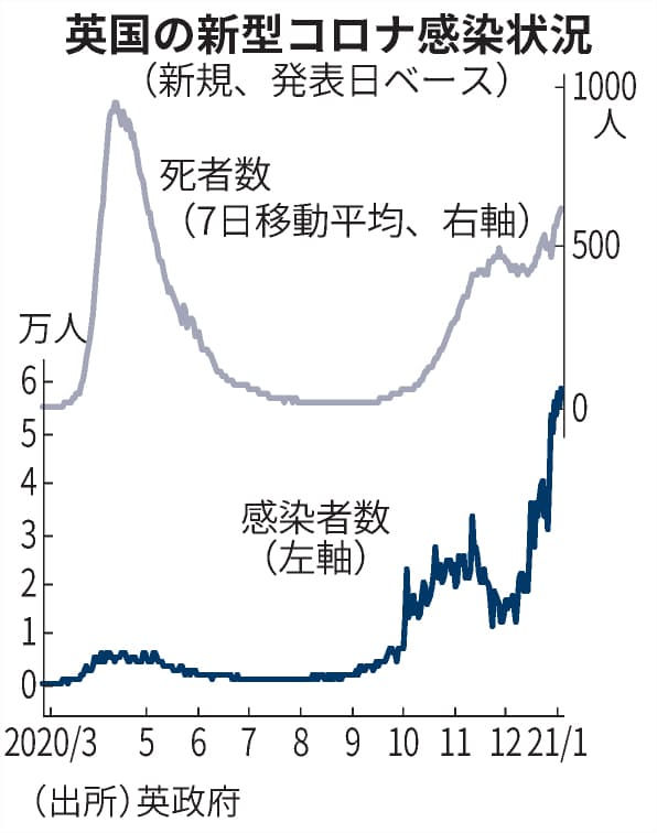4日に新たに発表された英国の感染者数は5万8784人と、1日あたりでの過去最多を更新した。5万人を超える日が7日連続となり、累計の死者数も7万5千人を超えて増加傾向が続く。クリスマス前から段階的に規制の強化が図られてきたが感染に歯止めがかからない状況だ。