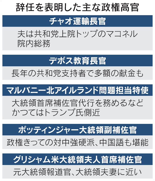 トランプ氏にとっては、政権幹部の辞任に歯止めがかからないのも懸念材料だ。7日にはチャオ運輸長官、デボス教育長官が閣僚としては初めて辞任を表明した。議会乱入事件を受けた幹部の辞任は2ケタを超える勢いだ。