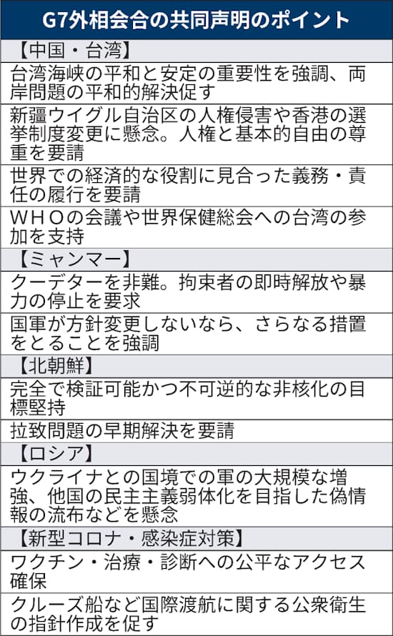 今回の2年ぶりの対面での外相会合では、権威主義を強める中国に民主主義陣営のG7が結束した対応を示せるかが焦点になっていた。共同声明では台湾を含めて全87項目中7項目を中国情勢に割いた。安全保障や経済政策など幅広い分野で懸念やけん制を表明した。