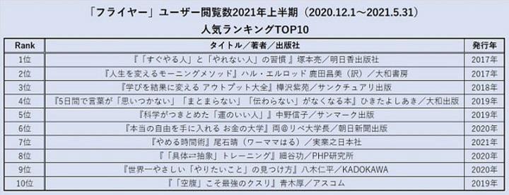 <書籍の要約サービス「flier」が、ユーザー閲覧数から導き出した2021年上半期ビジネス書人気ランキングTOP10を発表した>
