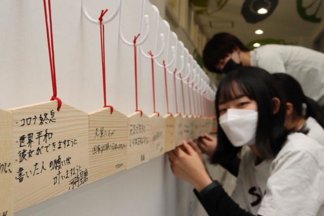 同大がオンラインで催す大学祭に合わせて企画し、交通安全運動などに取り組む「サプライズ企画部」が参加した。鶴林寺(同市加古川町北在家)で絵馬を購入し、2週間前から学内で配布。「コロナ終息」「健康でありますように」などの願いを書いてもらった。