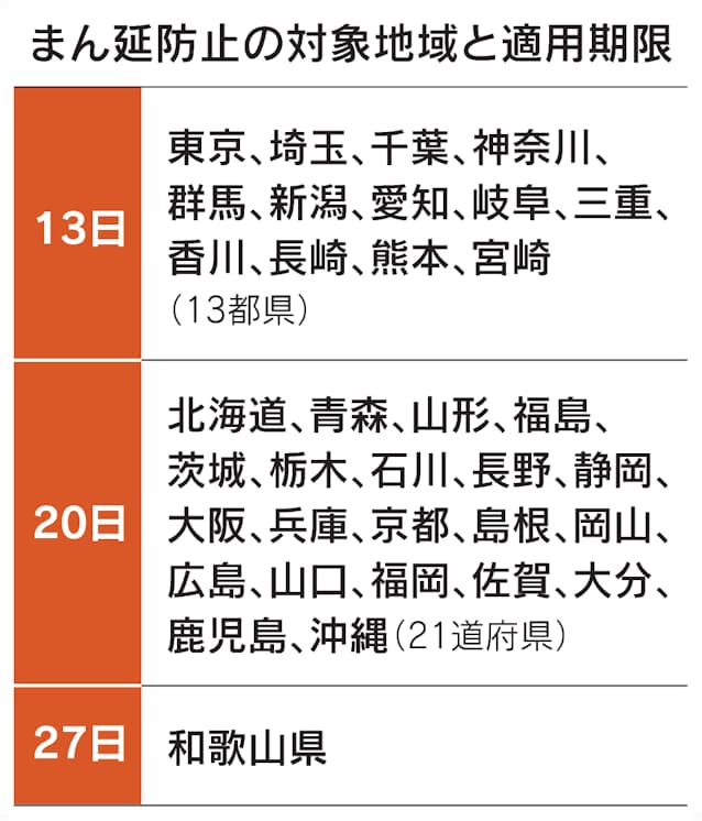 重点措置地域については今月後半に相次いで期限を迎える。大阪、兵庫、京都の関西3府県など計21道府県は20日までが適用期間だ。5日に追加した和歌山県は27日までとなる。