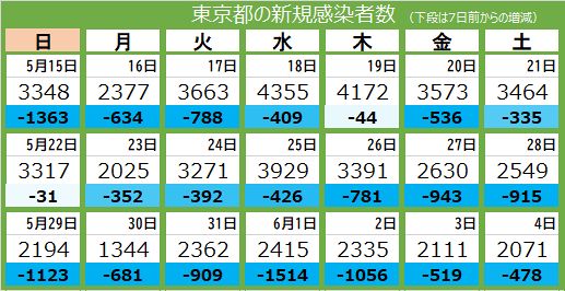 1週間平均の新規感染者数は4日時点で2118.9人で、前の週に比べて70.3%。都内の累計の患者数は154万9240人となった。