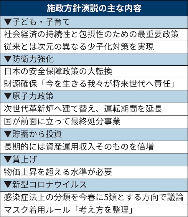 新型コロナウイルスの感染症法上の分類を今春に5類に変更する方向を明示した。マスクの着用ルールについて「考え方を整理していきたい」と言及した。感染症対策を担う「内閣感染症危機管理統括庁」を新設するための法案を出す。