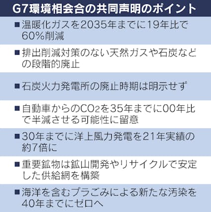 自動車から出るCO2を巡っては、G7各国が保有する車からの排出量を35年までに00年比で半減できるよう留意するとした。毎年進捗を確認していくことで合意。米英などは明確な目標を求めていたが、一定の柔軟性がある表現にとどめた。