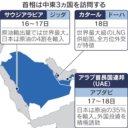 中東が持つ豊富な石油や天然ガスを原料に、日本が持つ脱炭素の技術を掛け合わせて次世代エネルギーを世界に送る狙いだ。燃やしても二酸化炭素(CO2)を出さないアンモニアの共同生産に向け双方の官民による枠組みを設ける。
